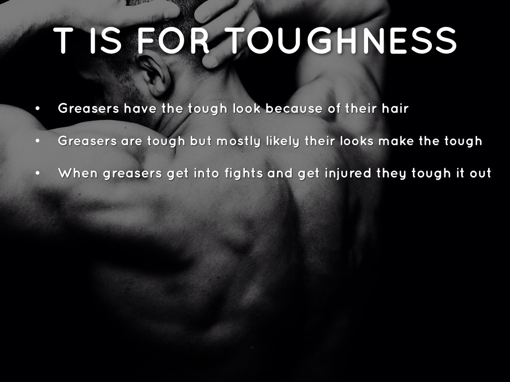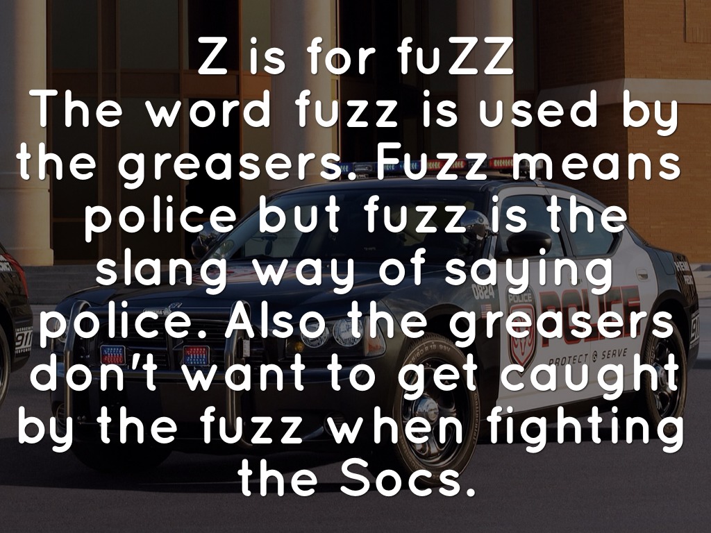 Z is for fuZZ The word fuzz is used by the greasers. Fuzz means police but fuzz is the slang way of saying police. Also the greasers don't want to get caught by the fuzz when fighting the Socs.
