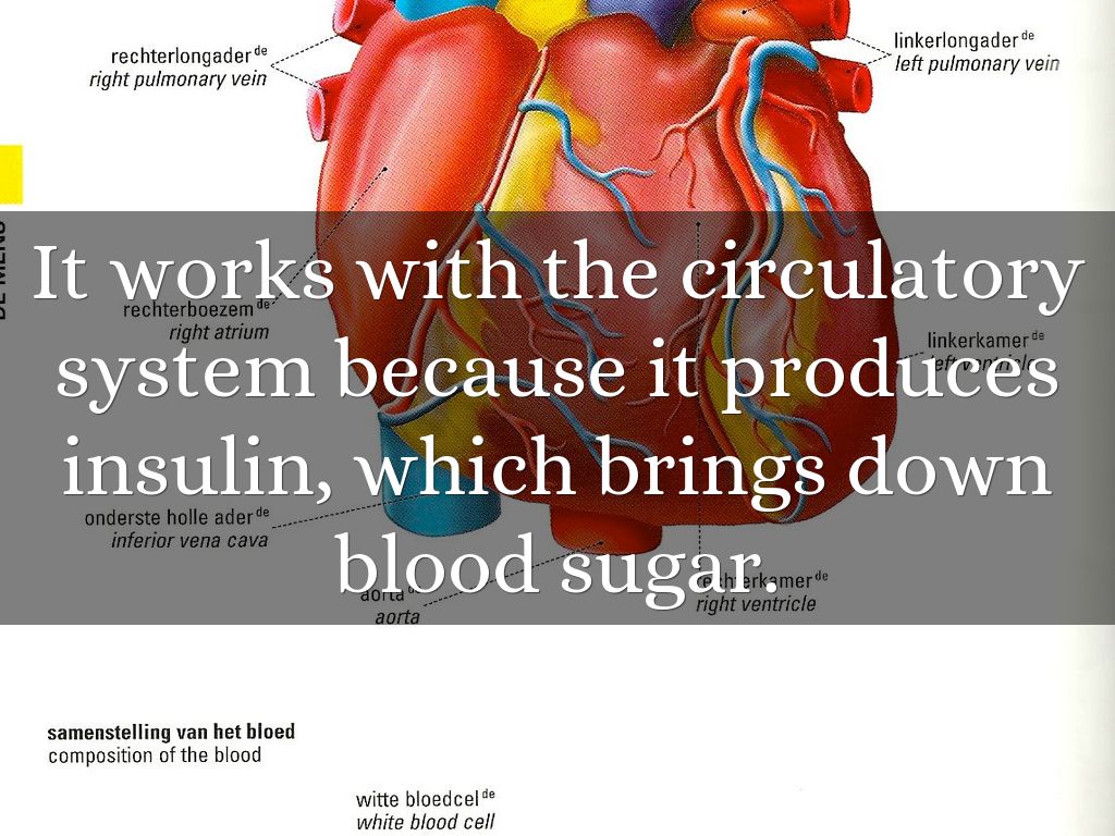 It works with the circulatory system because it produces insulin, which brings down blood sugar.