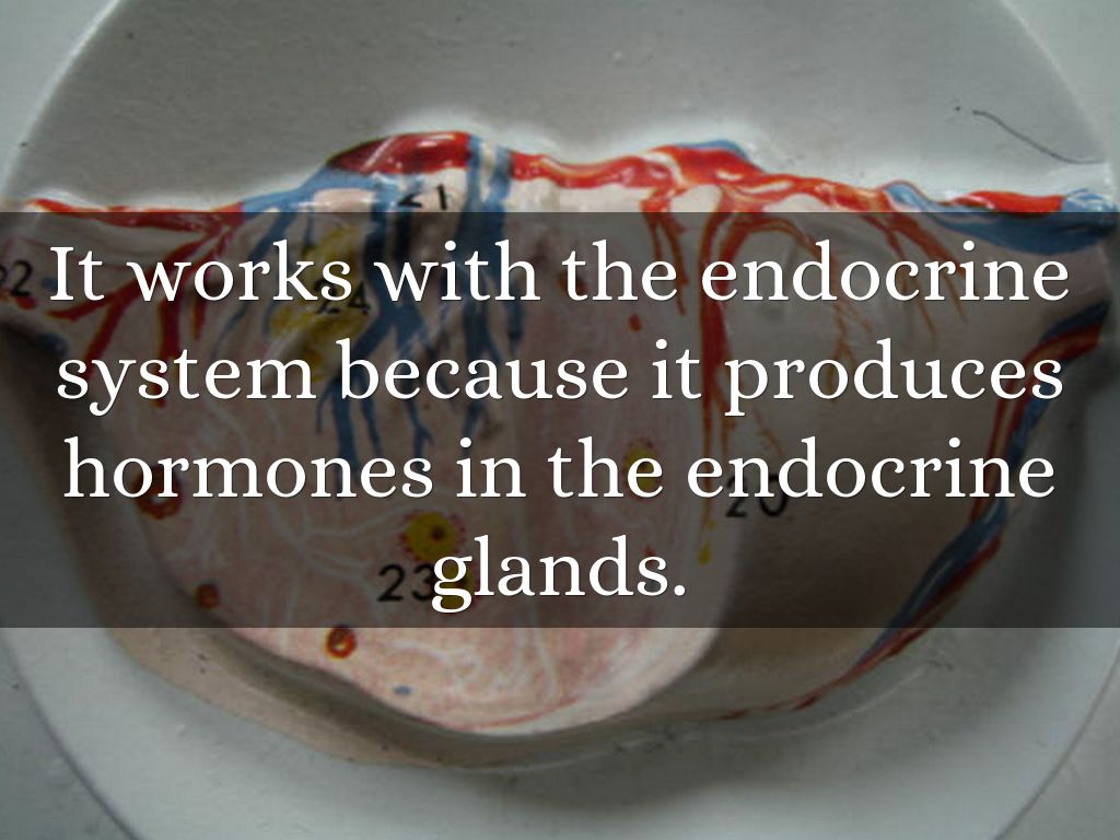 It works with the endocrine system because it produces hormones in the endocrine glands.