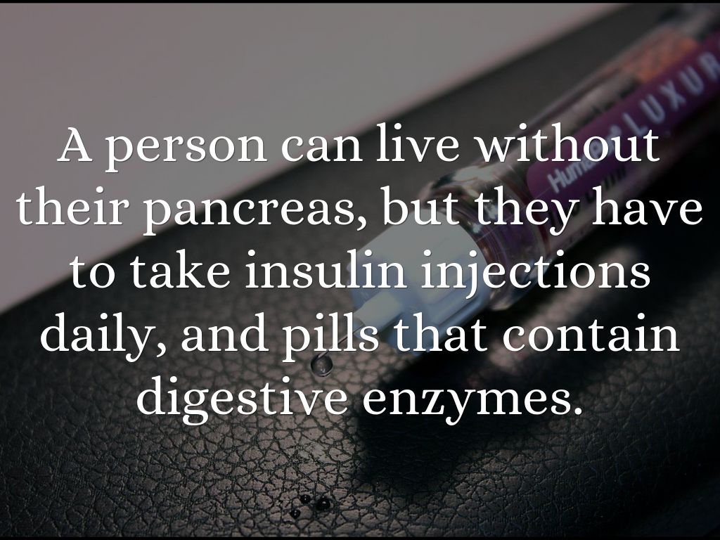 A person can live without their pancreas, but they have to take insulin injections daily, and pills that contain digestive enzymes.