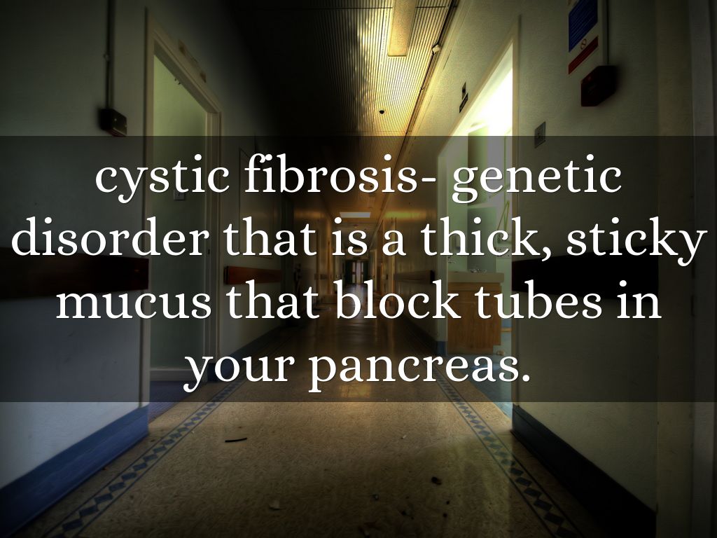 cystic fibrosis- genetic disorder that is a thick, sticky mucus that block tubes in your pancreas.