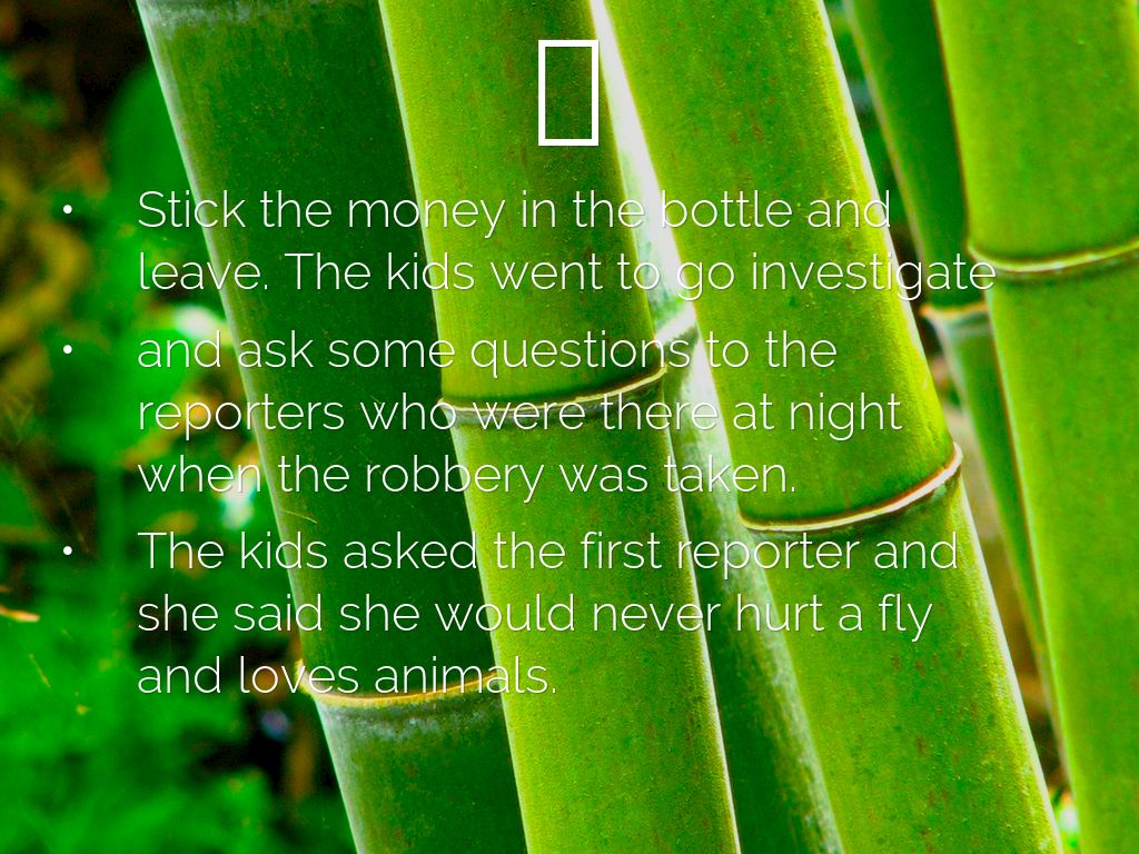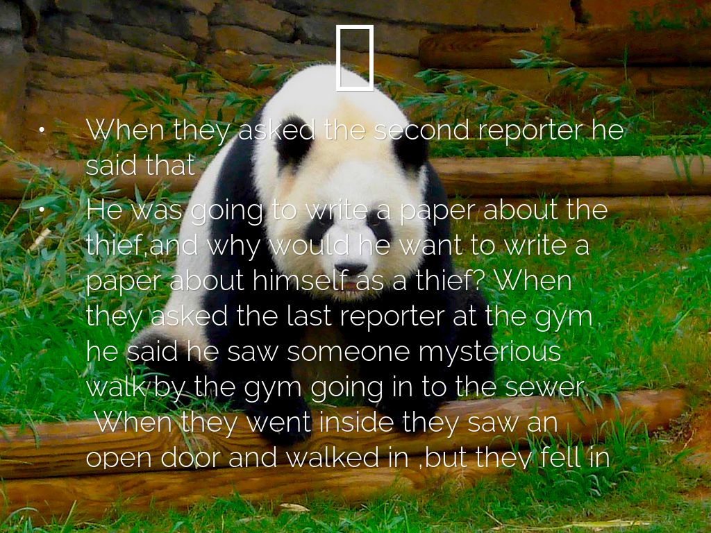He was going to write a paper about the thief,and why would he want to write a paper about himself as a thief? When they asked the last reporter at the gym he said he saw someone mysterious walk by the gym going in to the sewer. When they went inside they saw an open door and walked in ,but they fell in and landed in the tar pits. They heard a noise and it was the panda.They called officer Fallon and took the panda back to the zoo with its mom.