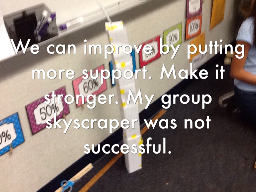 We can improve by putting more support. Make it stronger. My group skyscraper was not successful.