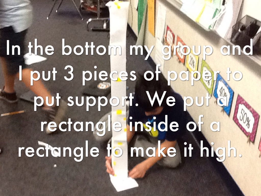 In the bottom my group and I put 3 pieces of paper to put support. We put a rectangle inside of a rectangle to make it high.