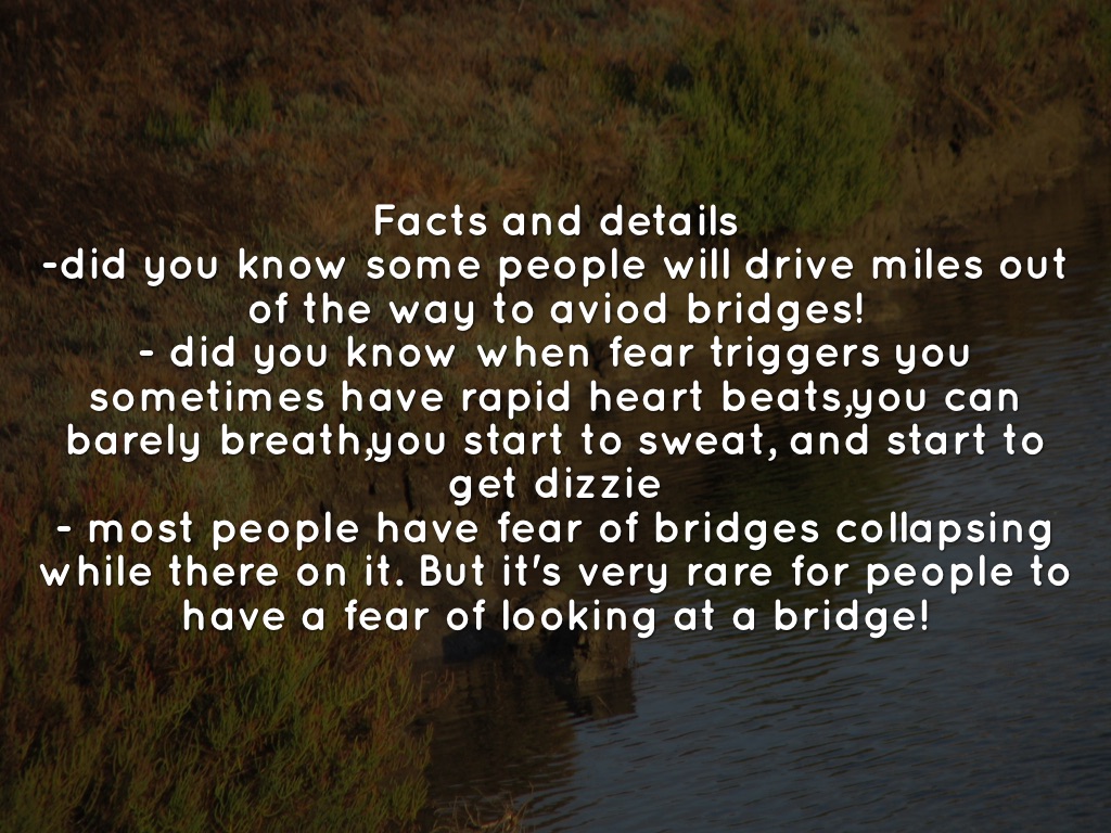 Facts and details -did you know some people will drive miles out of the way to aviod bridges! - did you know when fear triggers you sometimes have rapid heart beats,you can barely breath,you start to sweat, and start to get dizzie - most people have fear of bridges collapsing while there on it. But it's very rare for people to have a fear of looking at a bridge!