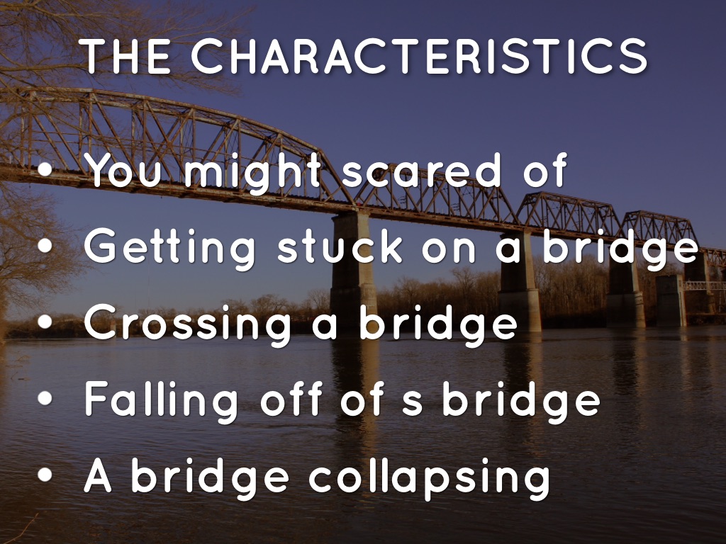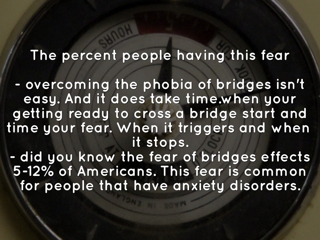 - overcoming the phobia of bridges isn't easy. And it does take time.when your getting ready to cross a bridge start and time your fear. When it triggers and when it stops. - did you know the fear of bridges effects 5-12% of Americans. This fear is common for people that have anxiety disorders.