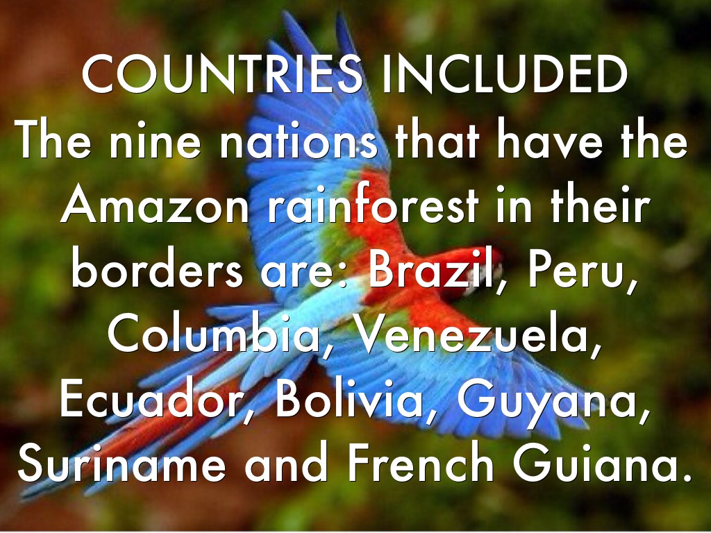 The nine nations that have the Amazon rainforest in their borders are: Brazil, Peru, Columbia, Venezuela, Ecuador, Bolivia, Guyana, Suriname and French Guiana.