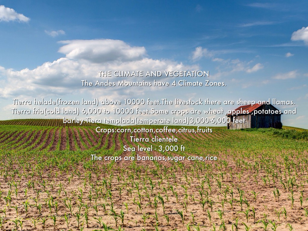 Tierra fria(cold land) 6,000 to 10000 feet.Some crops are wheat ,apples ,potatoes and barley.Tiera templada(temperate land)3,000-6,000 feet