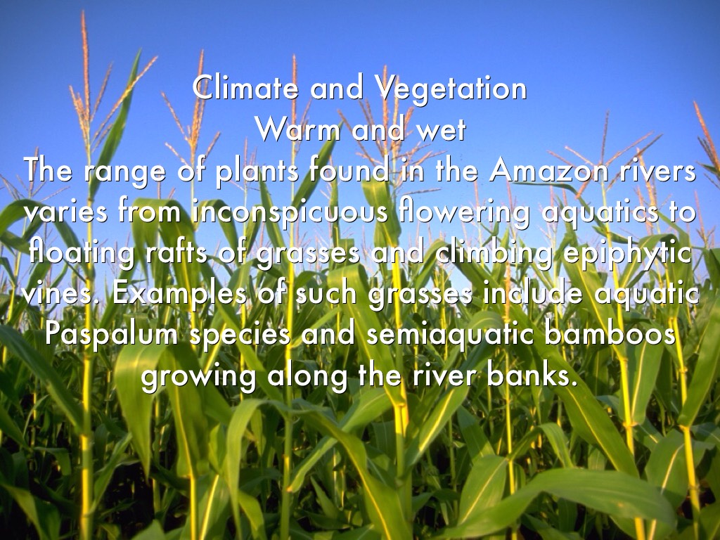 The range of plants found in the Amazon rivers varies from inconspicuous flowering aquatics to floating rafts of grasses and climbing epiphytic vines. Examples of such grasses include aquatic Paspalum species and semiaquatic bamboos growing along the river banks.