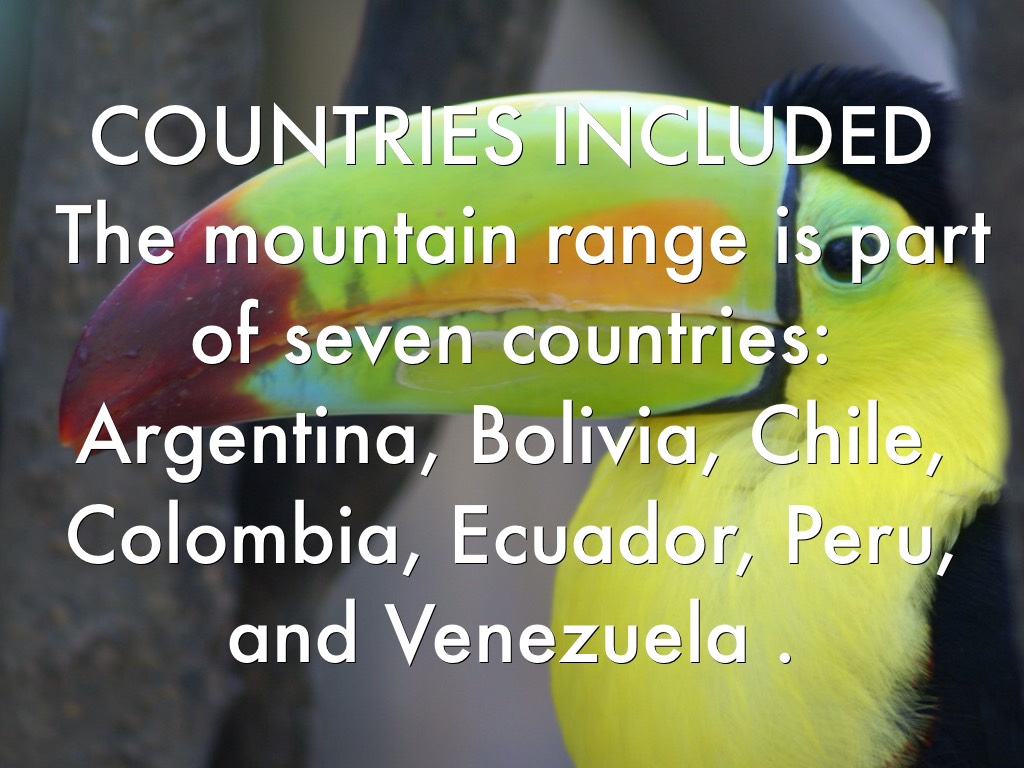 The mountain range is part of seven countries: Argentina, Bolivia, Chile, Colombia, Ecuador, Peru, and Venezuela .