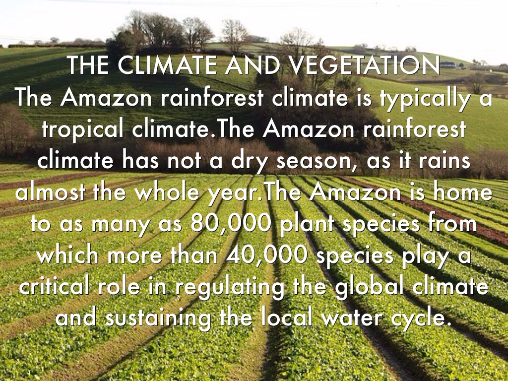The Amazon rainforest climate is typically a tropical climate.The Amazon rainforest climate has not a dry season, as it rains almost the whole year.The Amazon is home to as many as 80,000 plant species from which more than 40,000 species play a critical role in regulating the global climate and sustaining the local water cycle.