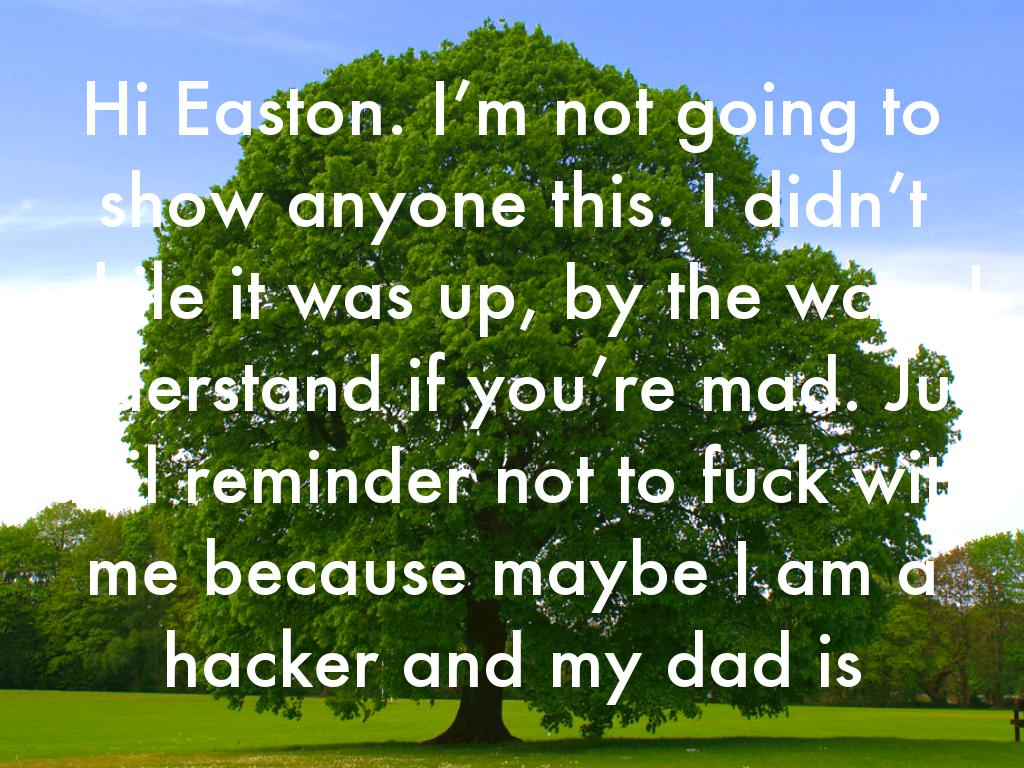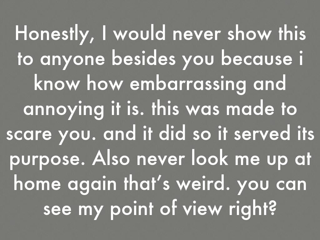 Honestly, I would never show this to anyone besides you because i know how embarrassing and annoying it is. this was made to scare you. and it did so it served its purpose. Also never look me up at home again that’s weird. you can see my point of view right?