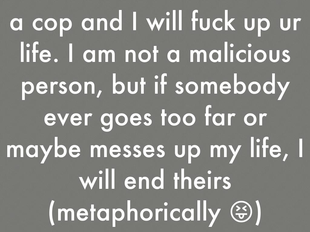 a cop and I will fuck up ur life. I am not a malicious person, but if somebody ever goes too far or maybe messes up my life, I will end theirs (metaphorically 😝)