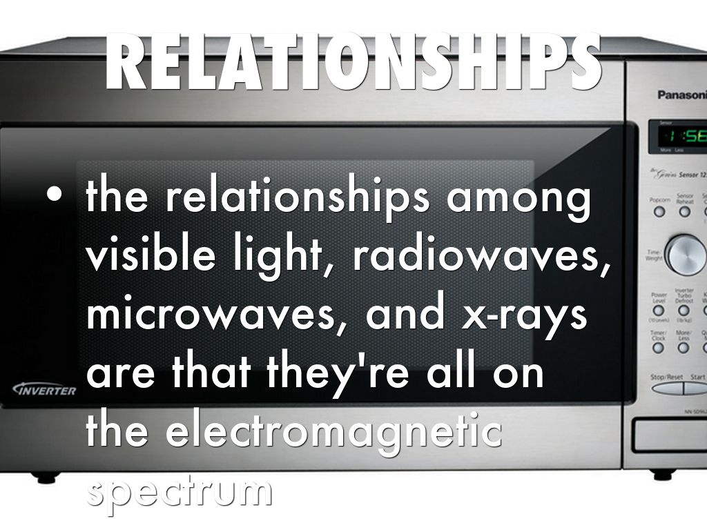 the relationships among visible light, radiowaves, microwaves, and x-rays are that they're all on the electromagnetic spectrum