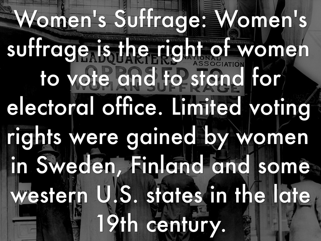 Women's Suffrage: Women's suffrage is the right of women to vote and to stand for electoral office. Limited voting rights were gained by women in Sweden, Finland and some western U.S. states in the late 19th century.