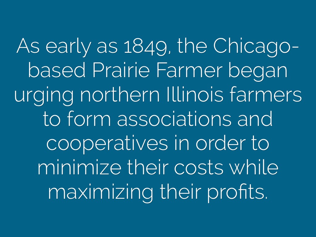 As early as 1849, the Chicago-based Prairie Farmer began urging northern Illinois farmers to form associations and cooperatives in order to minimize their costs while maximizing their profits.