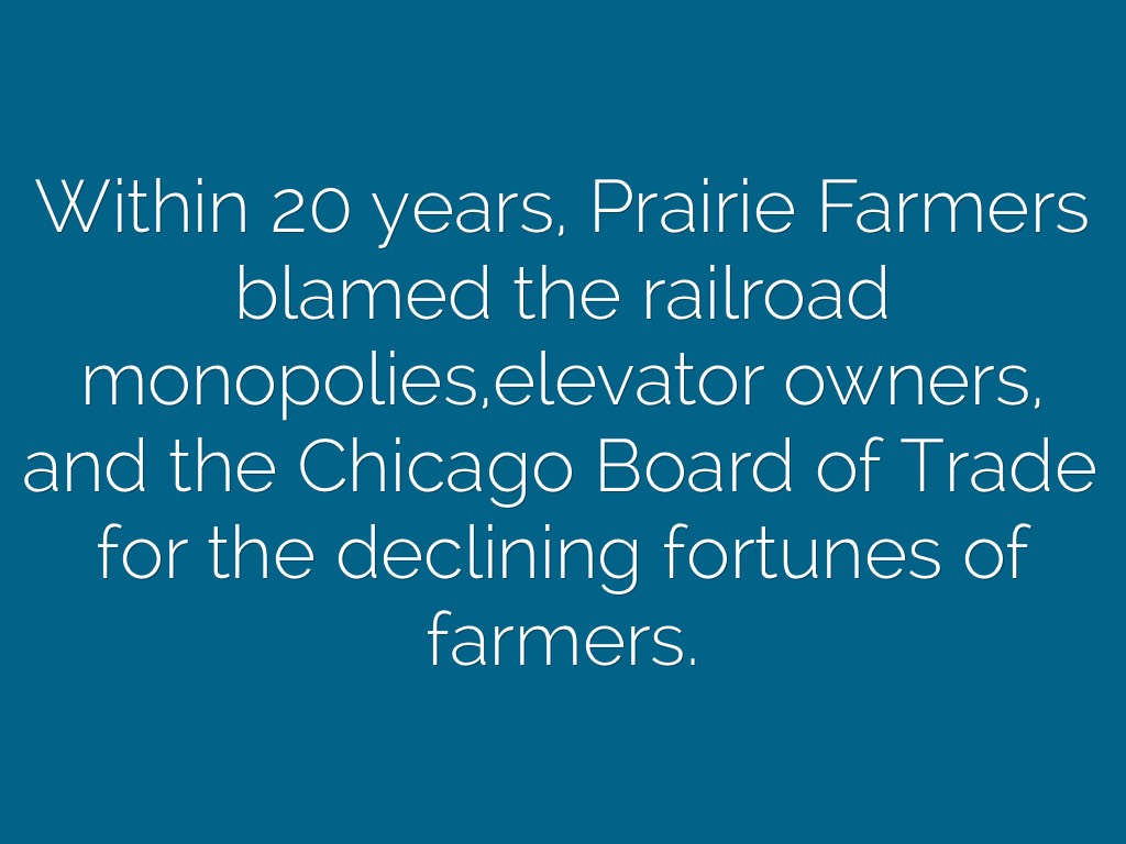Within 20 years, Prairie Farmers blamed the railroad monopolies,elevator owners, and the Chicago Board of Trade for the declining fortunes of farmers.