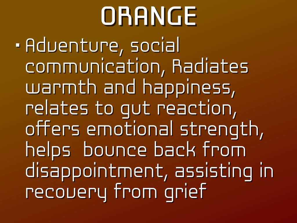 Adventure, social communication, Radiates warmth and happiness, relates to gut reaction, offers emotional strength, helps bounce back from disappointment, assisting in recovery from grief