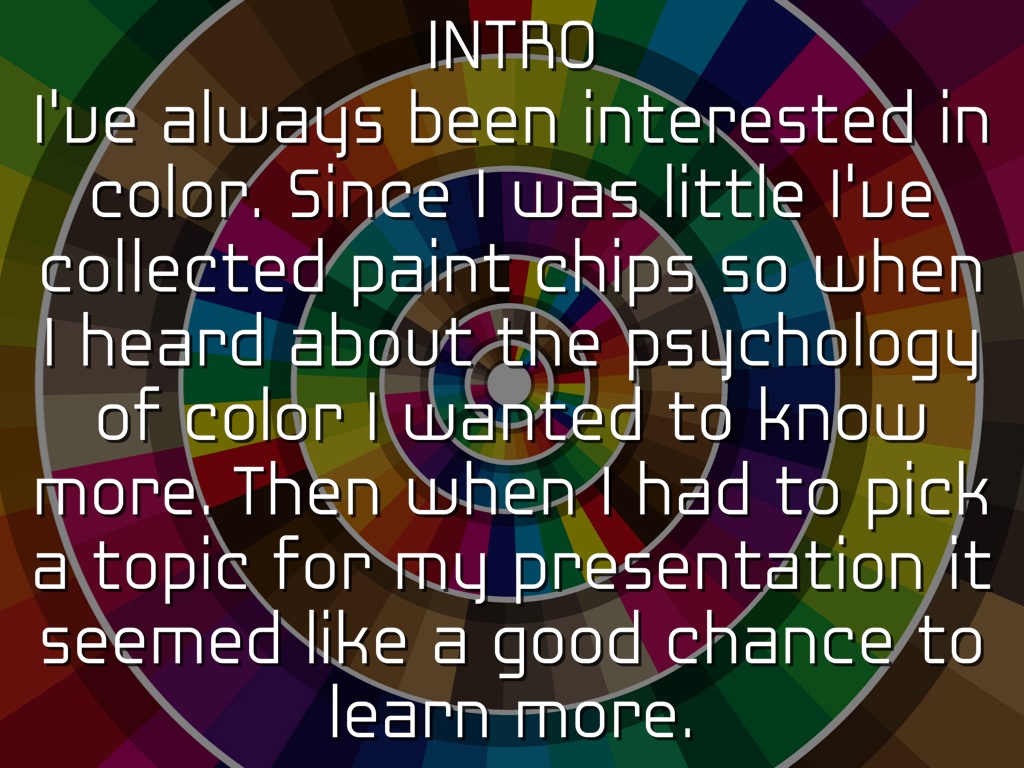 INTRO I've always been interested in color. Since I was little I've collected paint chips so when I heard about the psychology of color I wanted to know more. Then when I had to pick a topic for my presentation it seemed like a good chance to learn more.