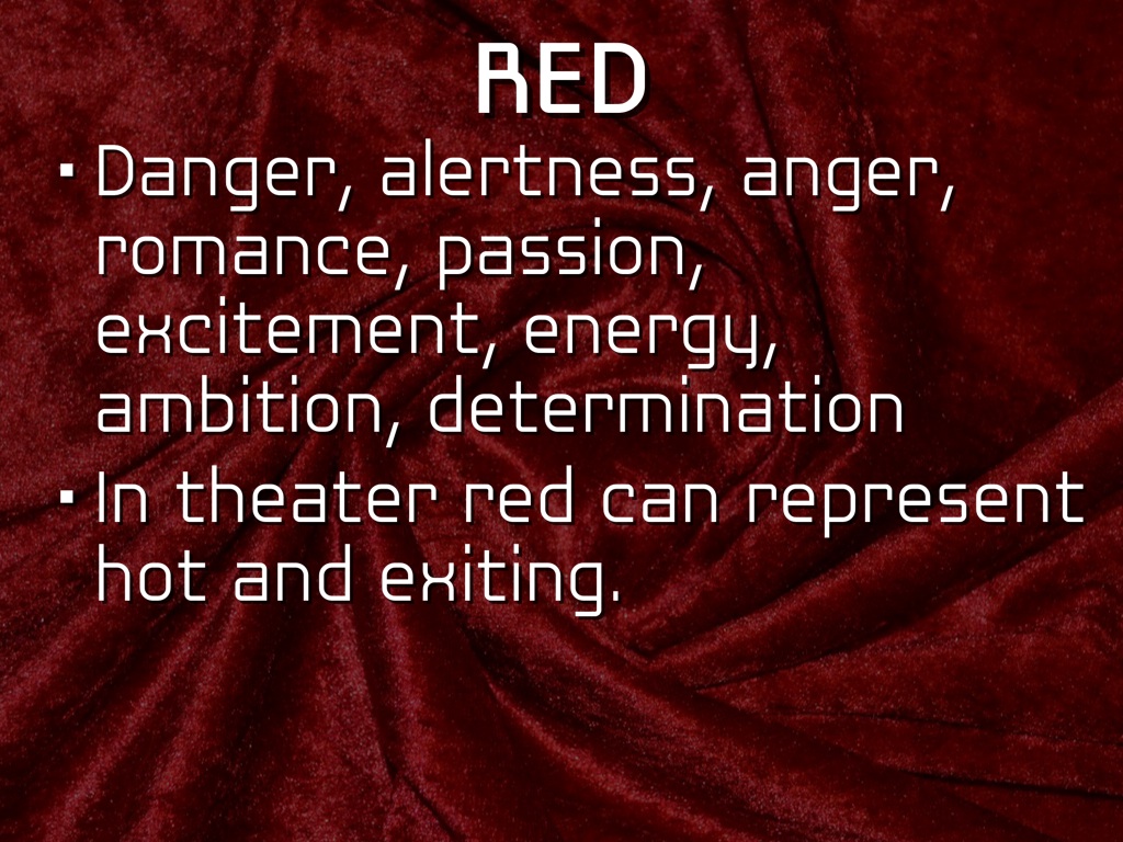 WHAT DO COLORS MEAN? There doesn't seem to be a completely strait forward answer to this because color can mean different things in different situations. However a good stage designer will know how to get their message across using lights.