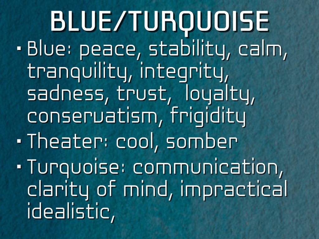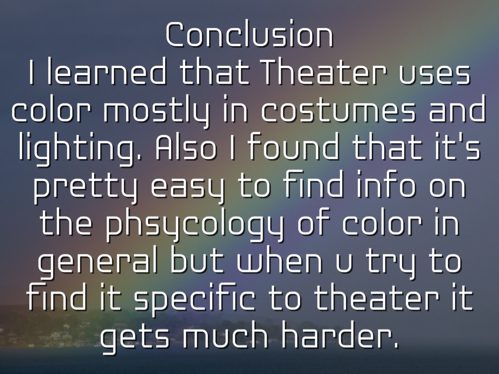 Conclusion I learned that Theater uses color mostly in costumes and lighting. Also I found that it's pretty easy to find info on the phsycology of color in general but when u try to find it specific to theater it gets much harder.