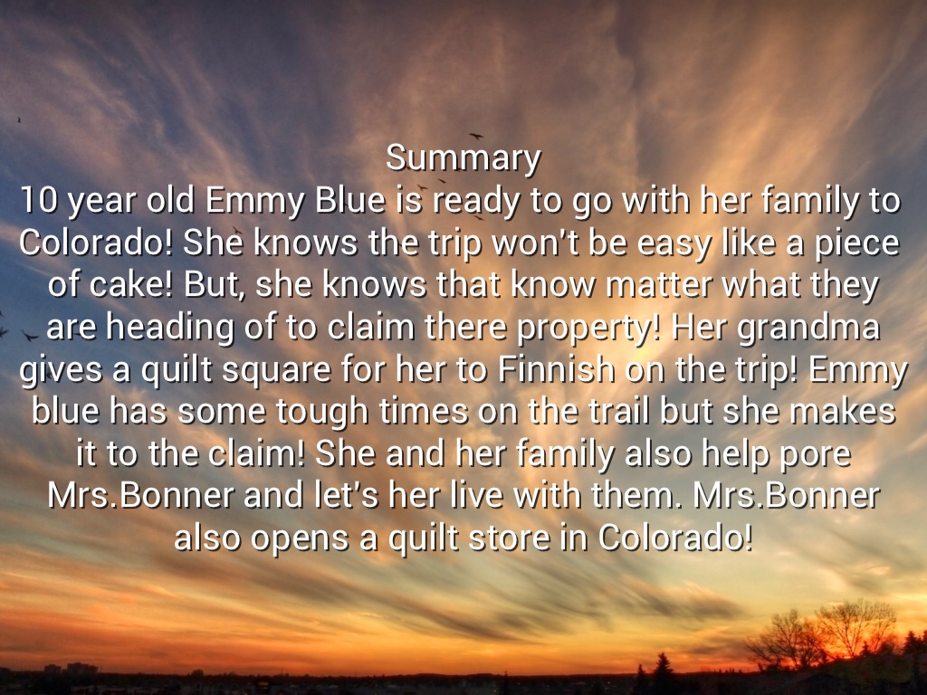 Summary 10 year old Emmy Blue is ready to go with her family to Colorado! She knows the trip won't be easy like a piece of cake! But, she knows that know matter what they are heading of to claim there property! Her grandma gives a quilt square for her to Finnish on the trip! Emmy blue has some tough times on the trail but she makes it to the claim! She and her family also help pore Mrs.Bonner and let's her live with them. Mrs.Bonner also opens a quilt store in Colorado!