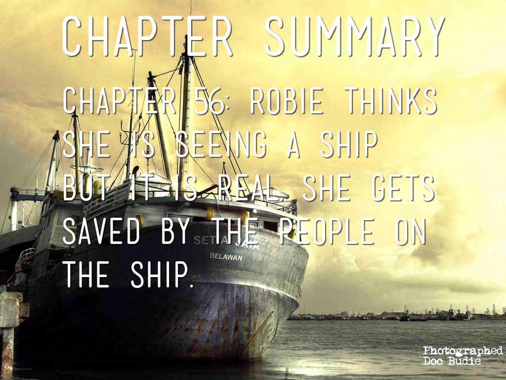 Chapter 56: Robie thinks she is seeing a ship but it is real. She gets saved by the people on the ship.