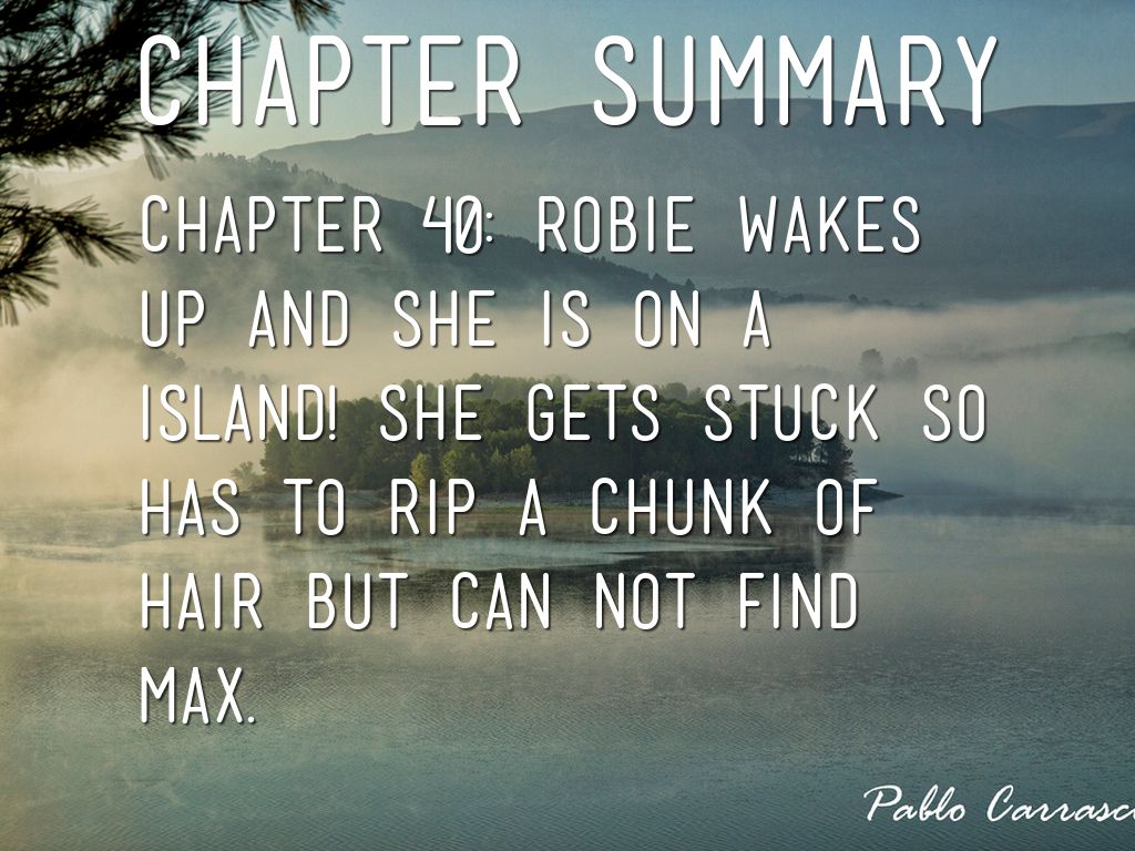 Chapter 40: Robie wakes up and she is on a Island! She gets stuck so has to rip a chunk of hair but can not find Max.
