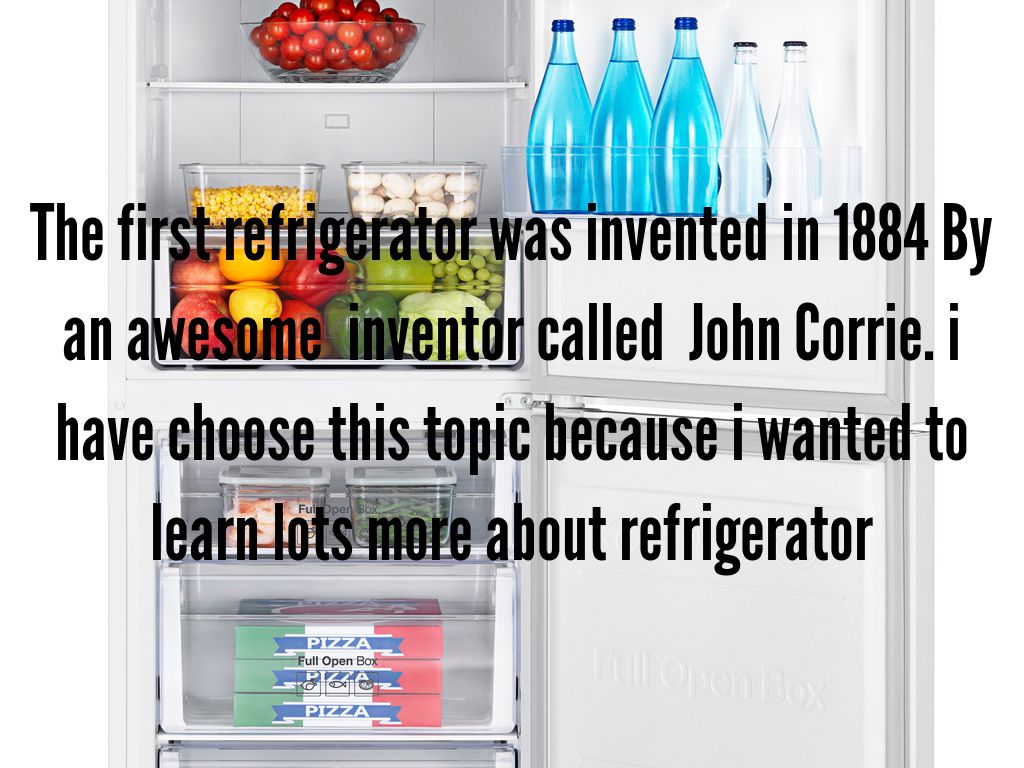 The first refrigerator was invented in 1884 By an awesome inventor called John Corrie. i have choose this topic because i wanted to learn lots more about refrigerator