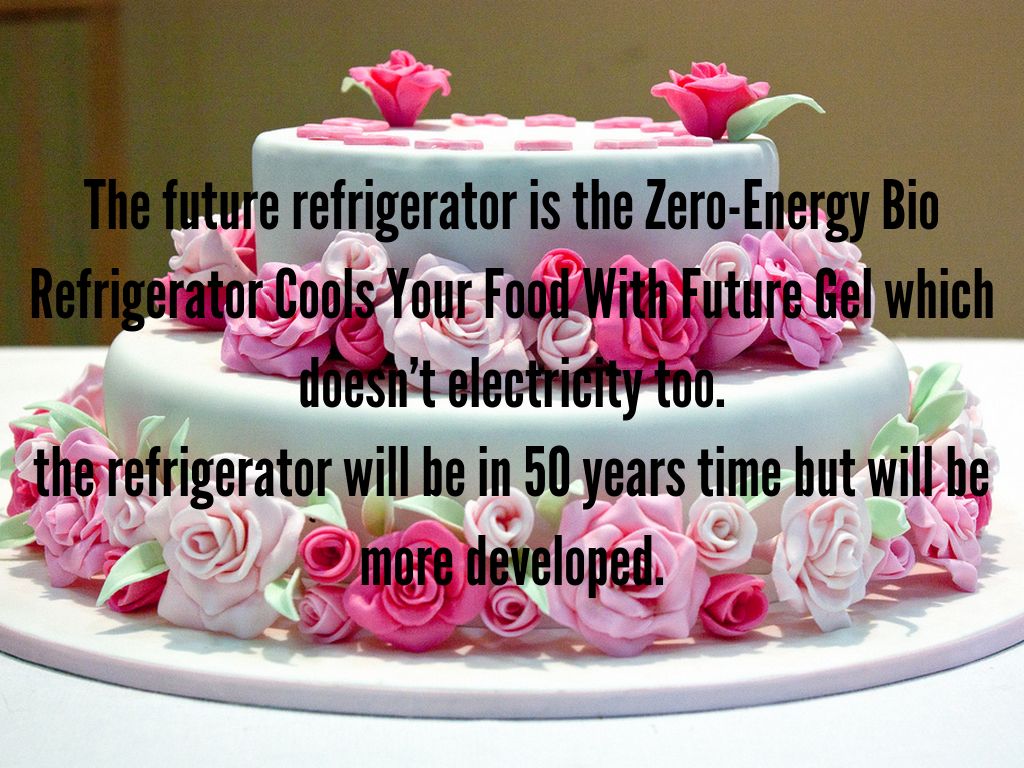 The future refrigerator is the Zero-Energy Bio Refrigerator Cools Your Food With Future Gel which doesn't electricity too. the refrigerator will be in 50 years time but will be more developed.