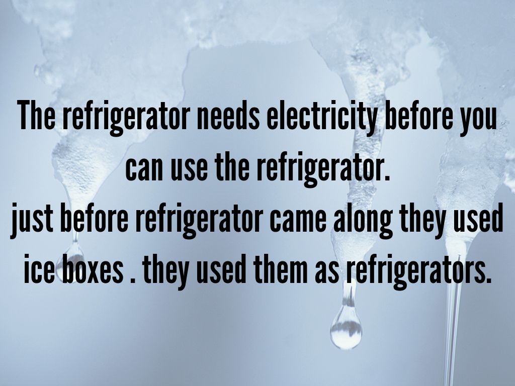 The refrigerator needs electricity before you can use the refrigerator. just before refrigerator came along they used ice boxes . they used them as refrigerators.