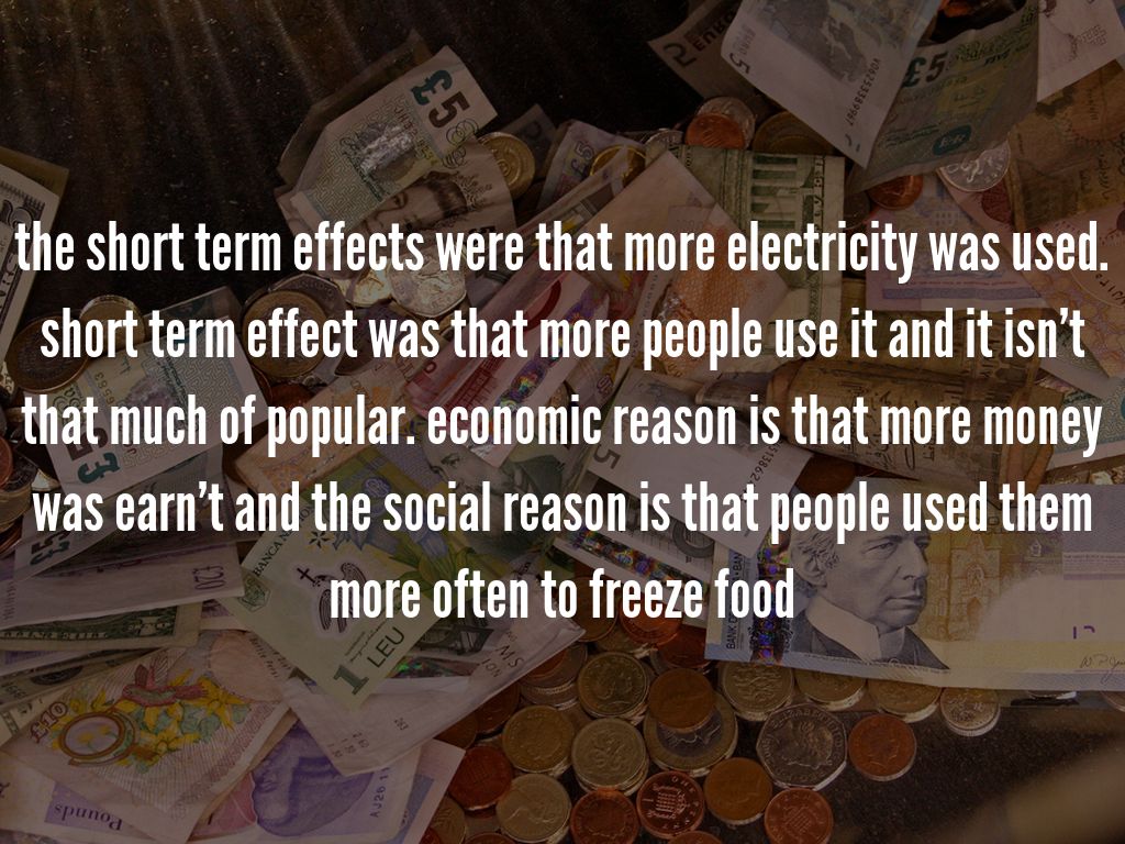 the short term effects were that more electricity was used. short term effect was that more people use it and it isn't that much of popular. economic reason is that more money was earn't and the social reason is that people used them more often to freeze food