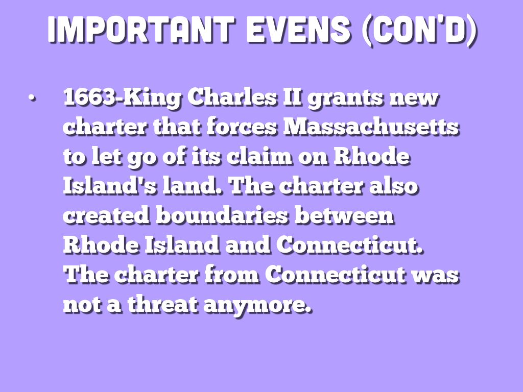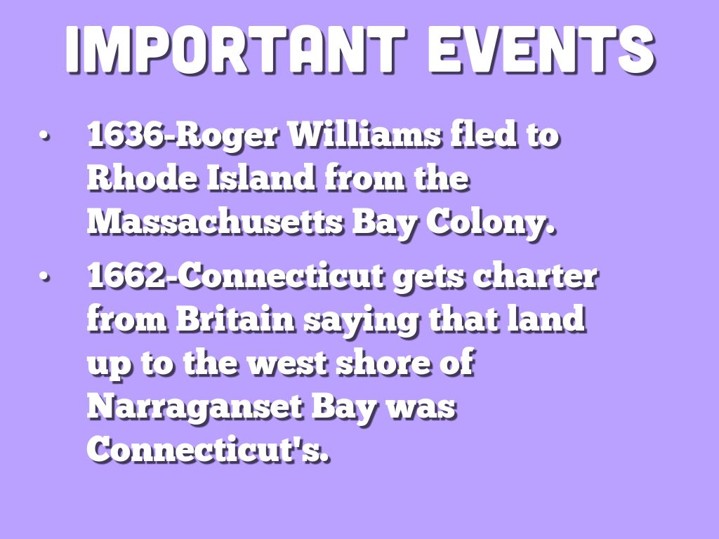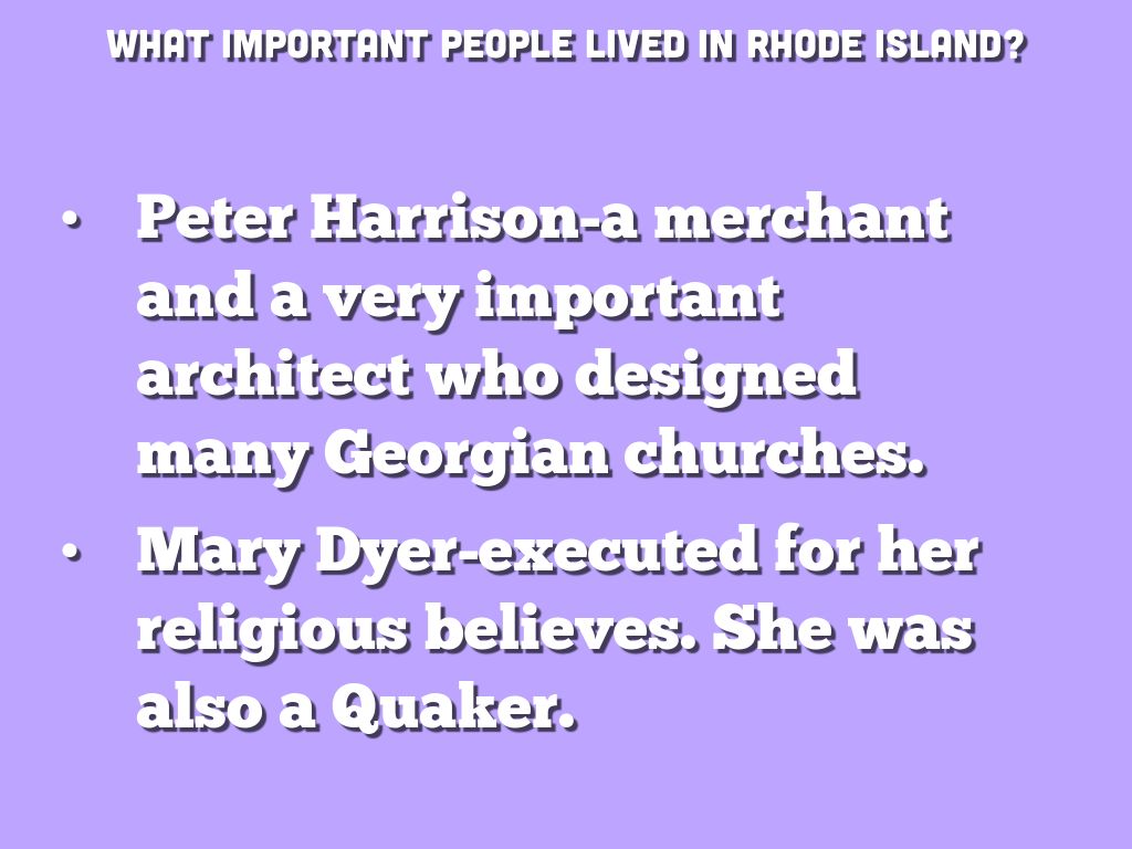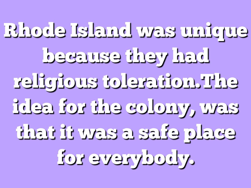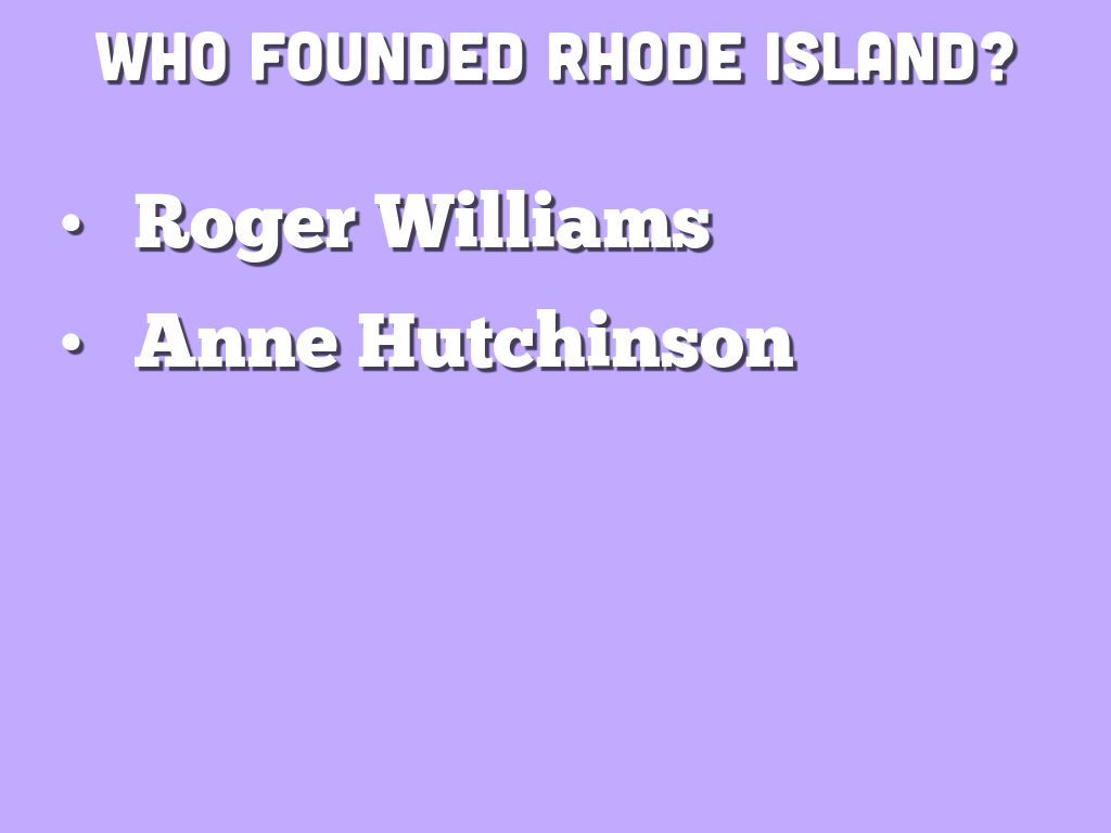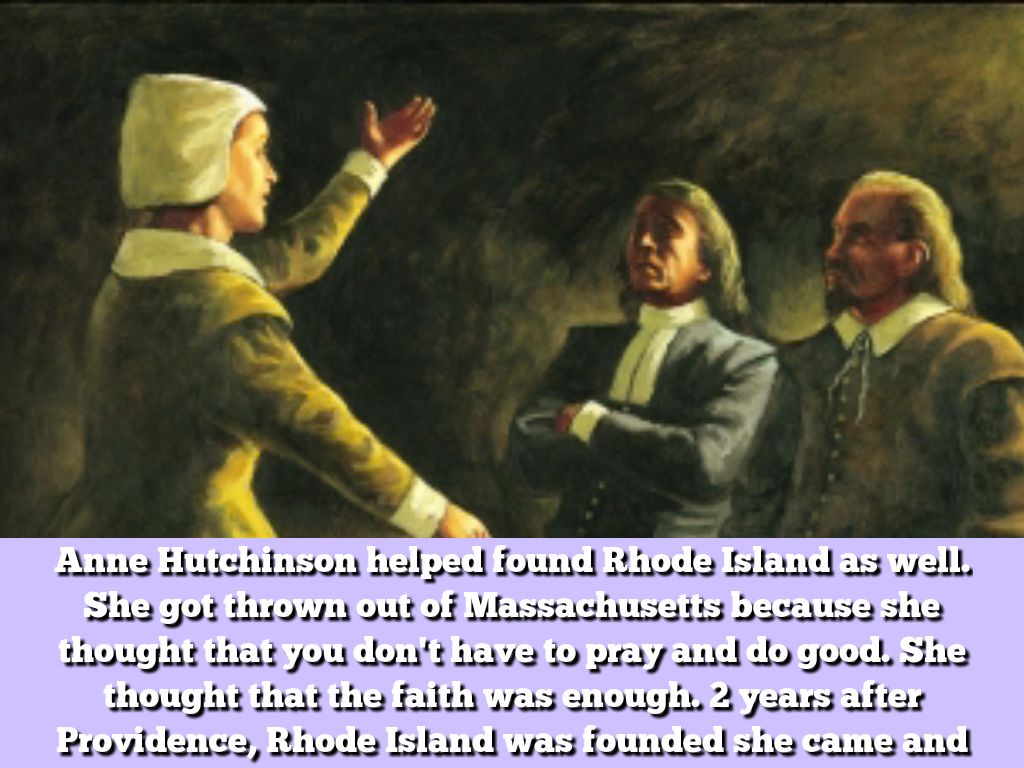Anne Hutchinson helped found Rhode Island as well. She got thrown out of Massachusetts because she thought that you don't have to pray and do good. She thought that the faith was enough. 2 years after Providence, Rhode Island was founded she came and helped found Portsmouth, Rhode Island.