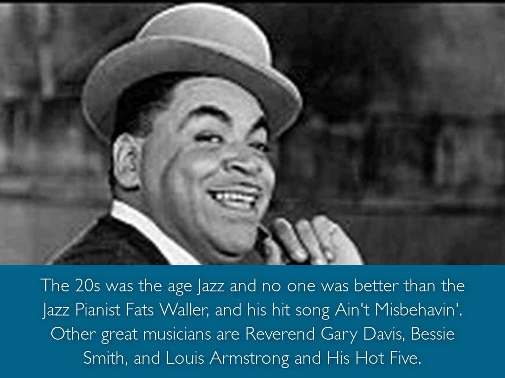 The 20s was the age Jazz and no one was better than the Jazz Pianist Fats Waller, and his hit song Ain't Misbehavin'. Other great musicians are Reverend Gary Davis, Bessie Smith, and Louis Armstrong and His Hot Five.