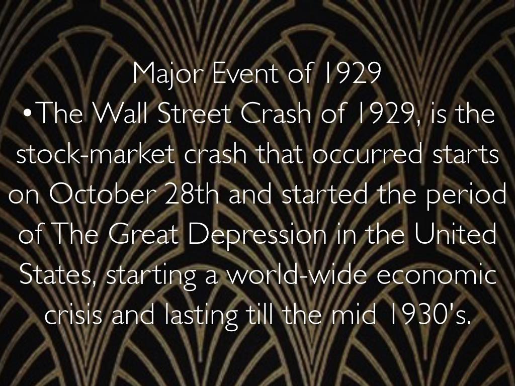 •The Wall Street Crash of 1929, is the stock-market crash that occurred starts on October 28th and started the period of The Great Depression in the United States, starting a world-wide economic crisis and lasting till the mid 1930's.