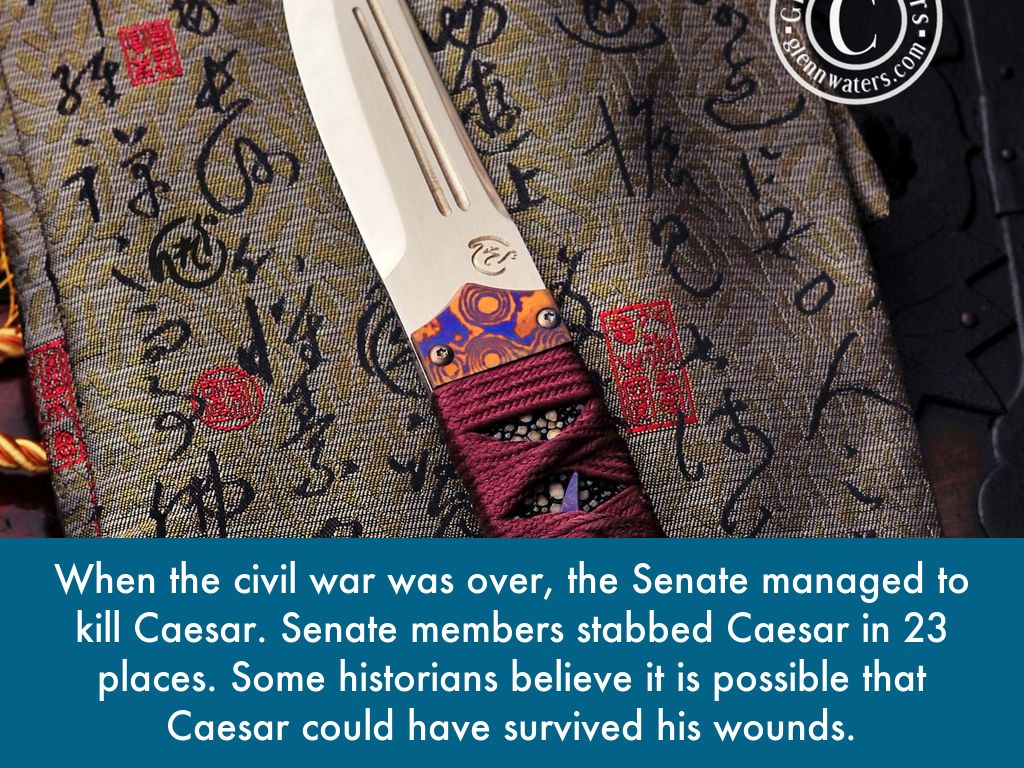 When the civil war was over, the Senate managed to kill Caesar. Senate members stabbed Caesar in 23 places. Some historians believe it is possible that Caesar could have survived his wounds.
