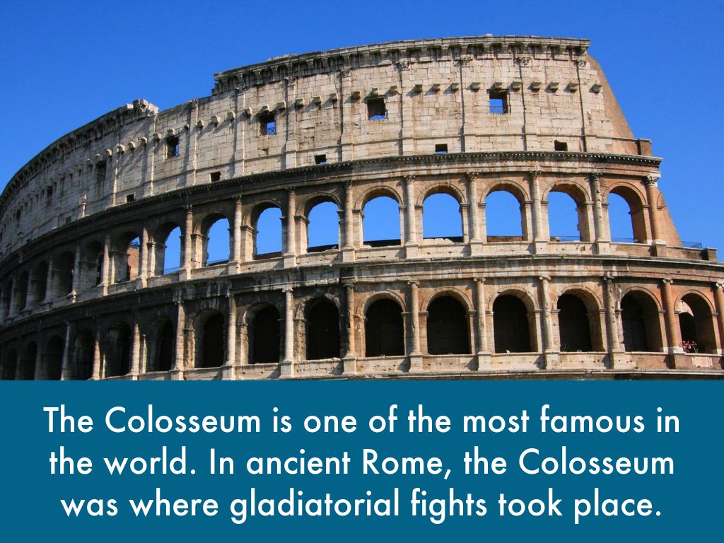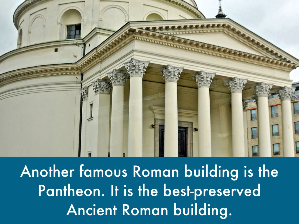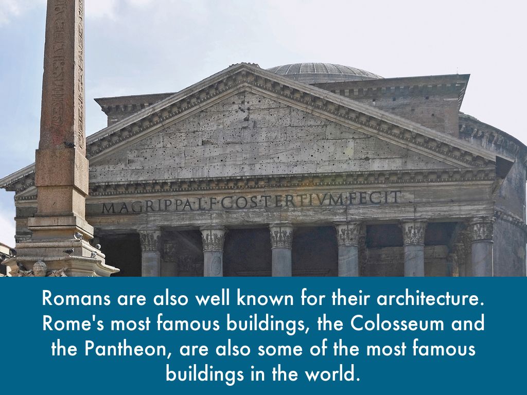 Romans are also well known for their architecture. Rome's most famous buildings, the Colosseum and the Pantheon, are also some of the most famous buildings in the world.