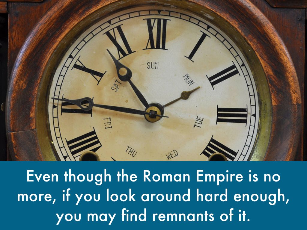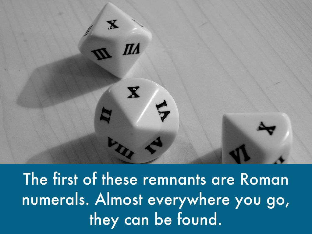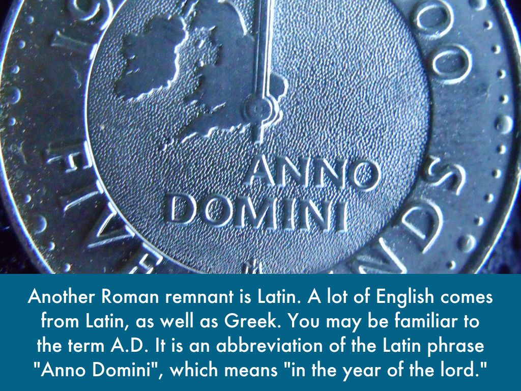 Another Roman remnant is Latin. A lot of English comes from Latin, as well as Greek. You may be familiar to the term A.D. It is an abbreviation of the Latin phrase "Anno Domini", which means "in the year of the lord."