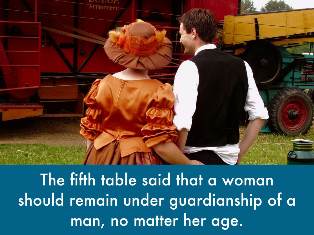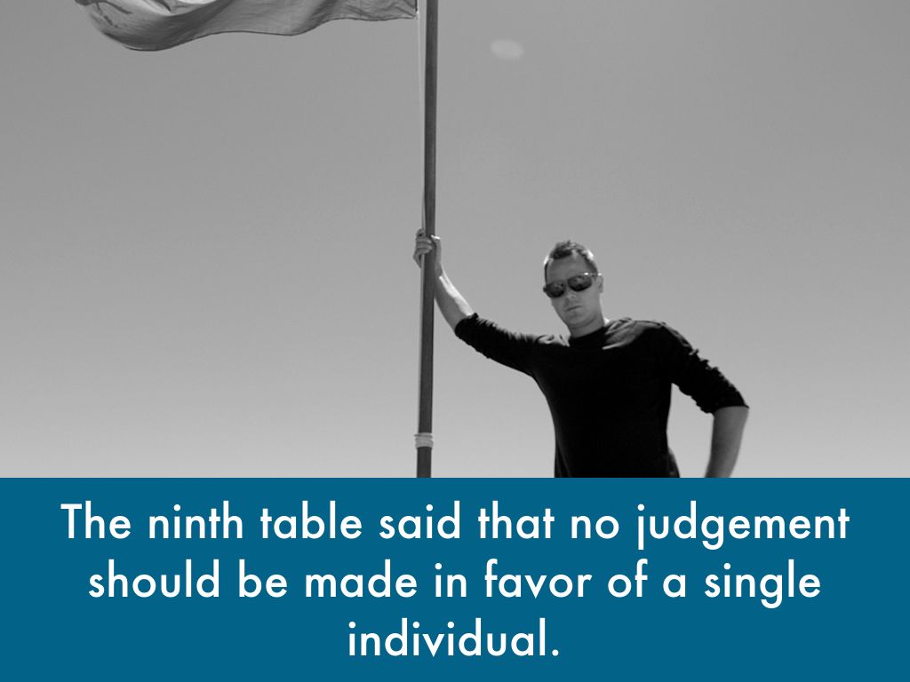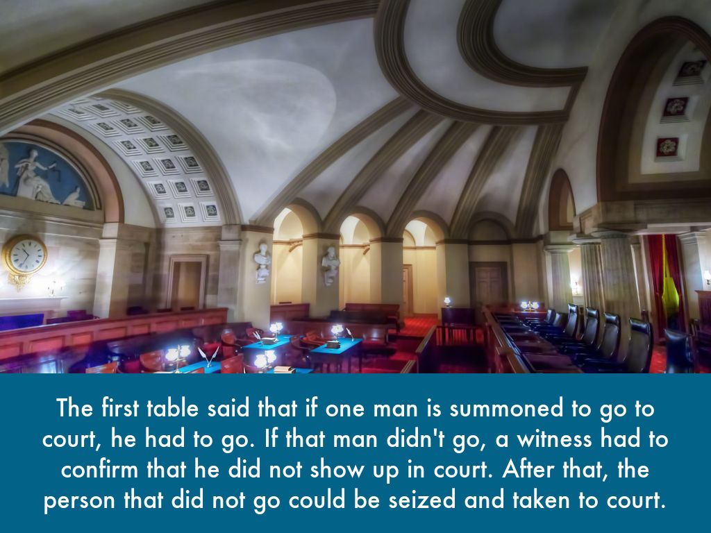 The first table said that if one man is summoned to go to court, he had to go. If that man didn't go, a witness had to confirm that he did not show up in court. After that, the person that did not go could be seized and taken to court.
