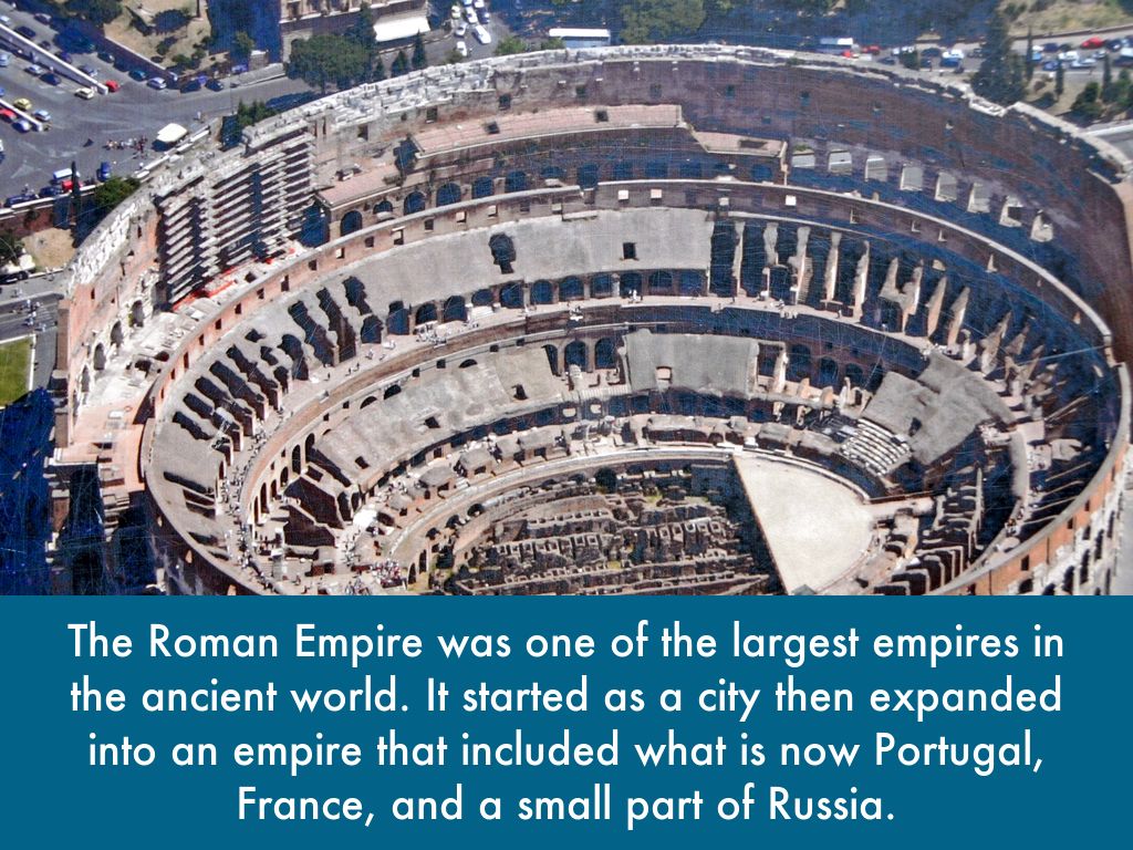 The Roman Empire was one of the largest empires in the ancient world. It started as a city then expanded into an empire that included what is now Portugal, France, and a small part of Russia.