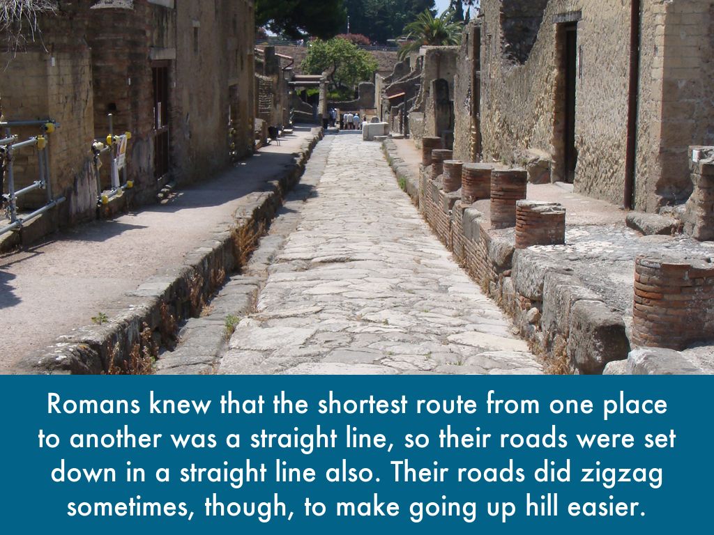 Romans knew that the shortest route from one place to another was a straight line, so their roads were set down in a straight line also. Their roads did zigzag sometimes, though, to make going up hill easier.