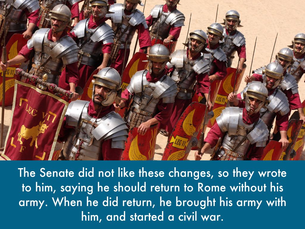 The Senate did not like these changes, so they wrote to him, saying he should return to Rome without his army. When he did return, he brought his army with him, and started a civil war.