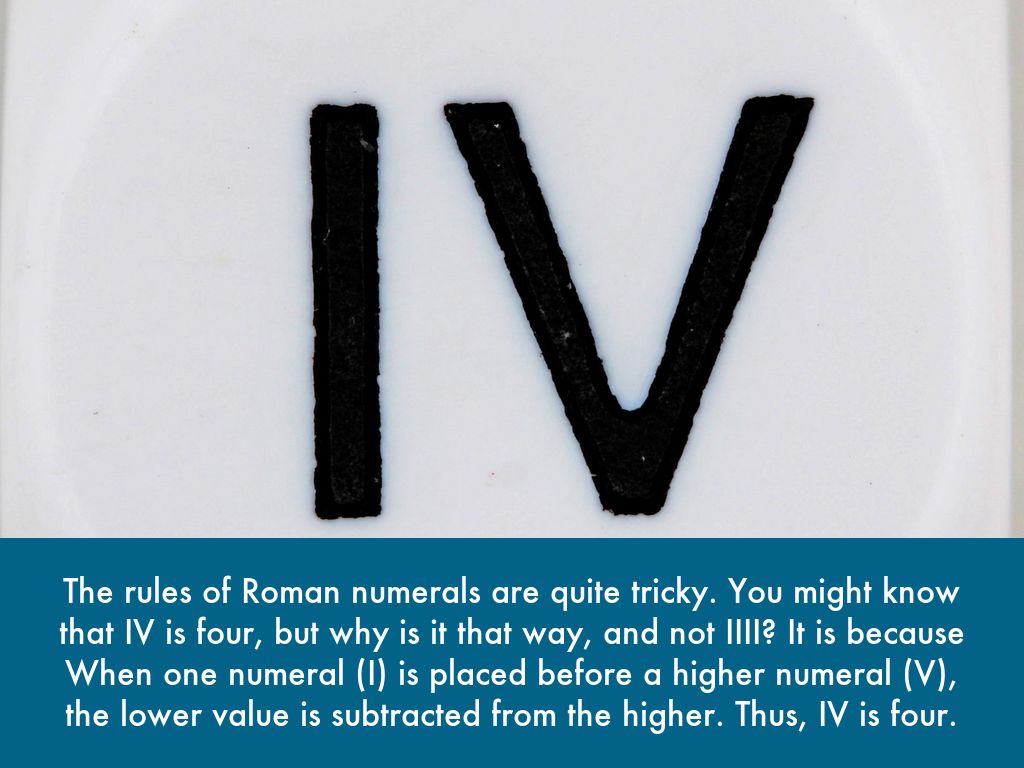 The rules of Roman numerals are quite tricky. You might know that IV is four, but why is it that way, and not IIII? It is because When one numeral (I) is placed before a higher numeral (V), the lower value is subtracted from the higher. Thus, IV is four.