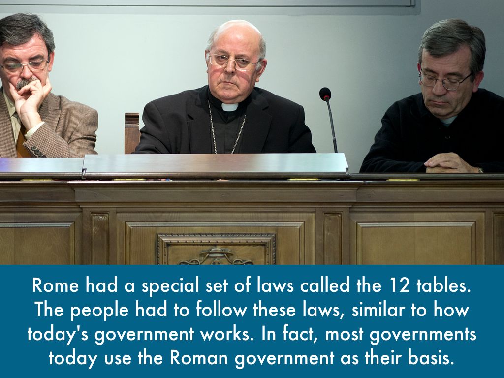 Rome had a special set of laws called the 12 tables. The people had to follow these laws, similar to how today's government works. In fact, most governments today use the Roman government as their basis.