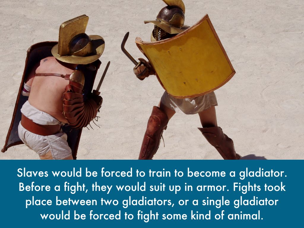 Slaves would be forced to train to become a gladiator. Before a fight, they would suit up in armor. Fights took place between two gladiators, or a single gladiator would be forced to fight some kind of animal.