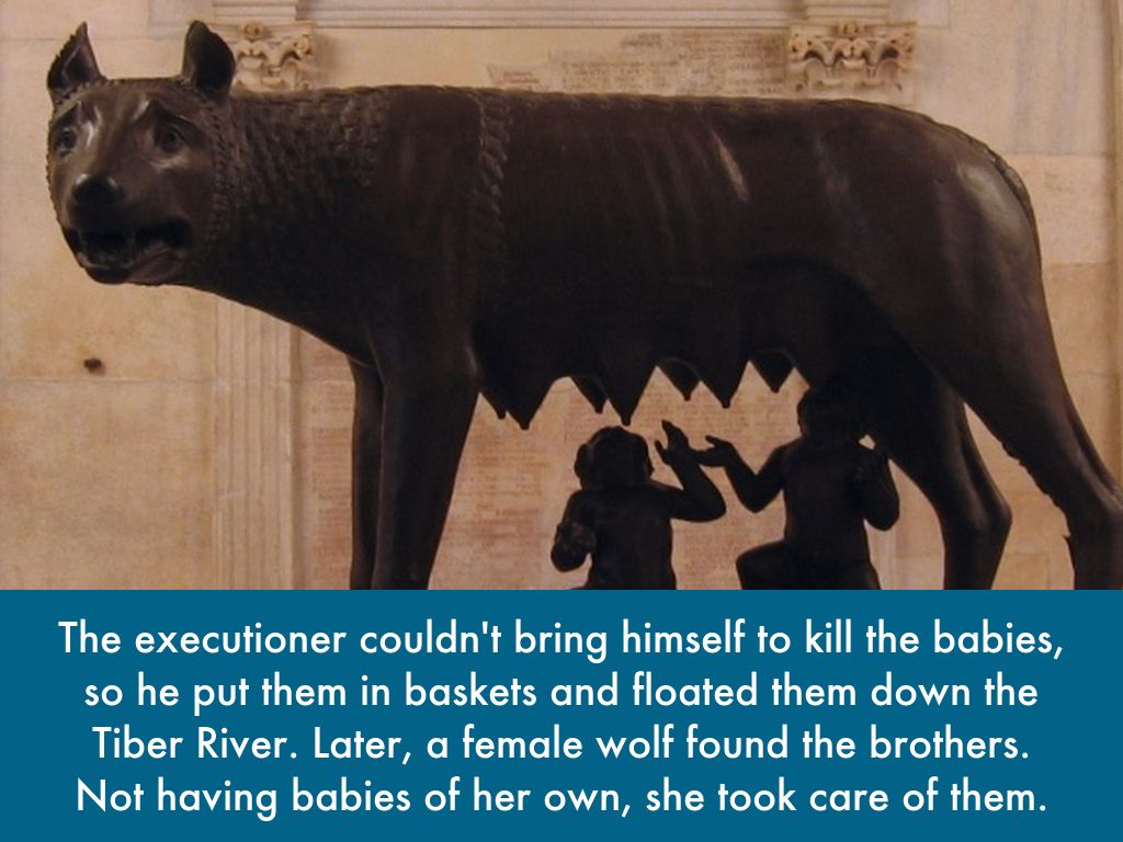 The executioner couldn't bring himself to kill the babies, so he put them in baskets and floated them down the Tiber River. Later, a female wolf found the brothers. Not having babies of her own, she took care of them.