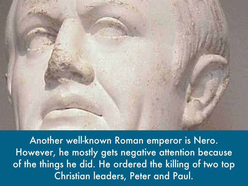 Another well-known Roman emperor is Nero. However, he mostly gets negative attention because of the things he did. He ordered the killing of two top Christian leaders, Peter and Paul.