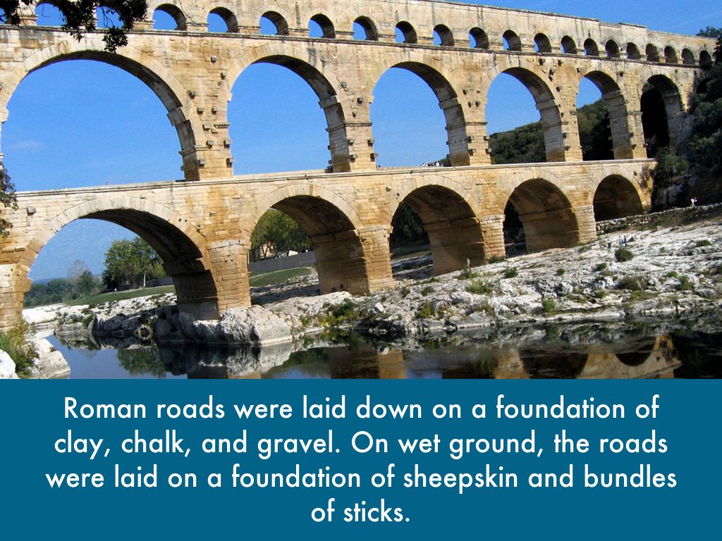 Roman roads were laid down on a foundation of clay, chalk, and gravel. On wet ground, the roads were laid on a foundation of sheepskin and bundles of sticks.