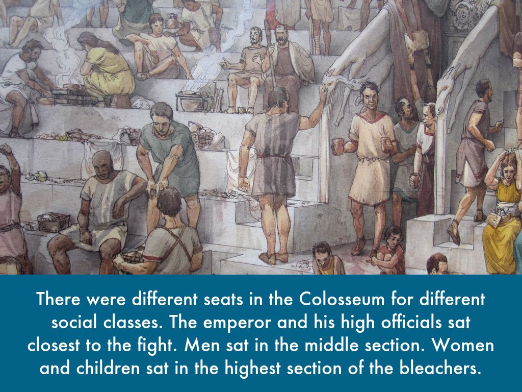 There were different seats in the Colosseum for different social classes. The emperor and his high officials sat closest to the fight. Men sat in the middle section. Women and children sat in the highest section of the bleachers.