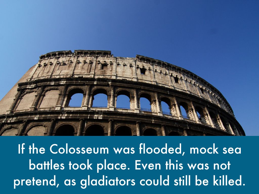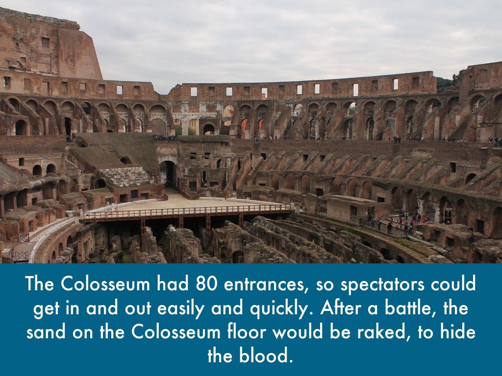 The Colosseum had 80 entrances, so spectators could get in and out easily and quickly. After a battle, the sand on the Colosseum floor would be raked, to hide the blood.